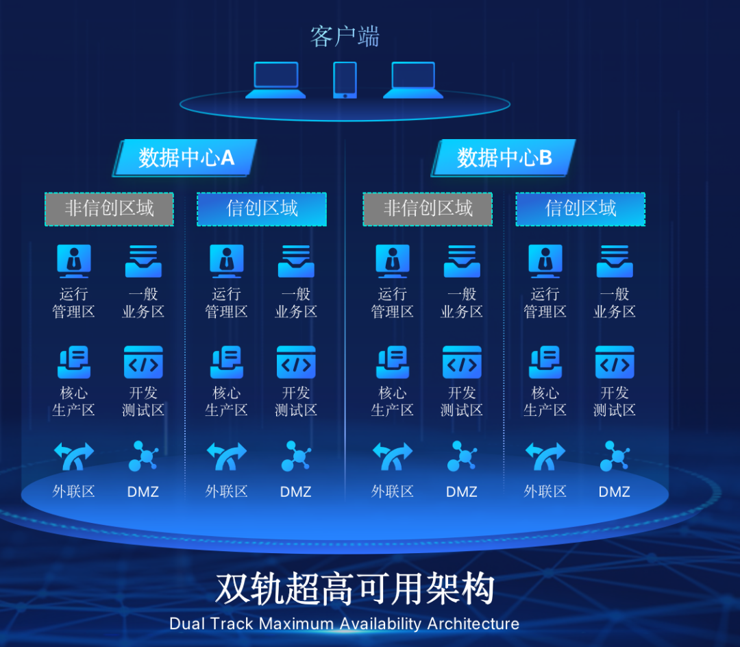 金年会jinnian在企业面临自主创新IT基础重构过程中,推出的全新架构双轨超高可用架构(简称DTMAA),在双活数据中心的分区调度基础上,添加每个数据中心内信创域和非信创域的分域调度,来实现分区分域协同的多活双轨超高可用。